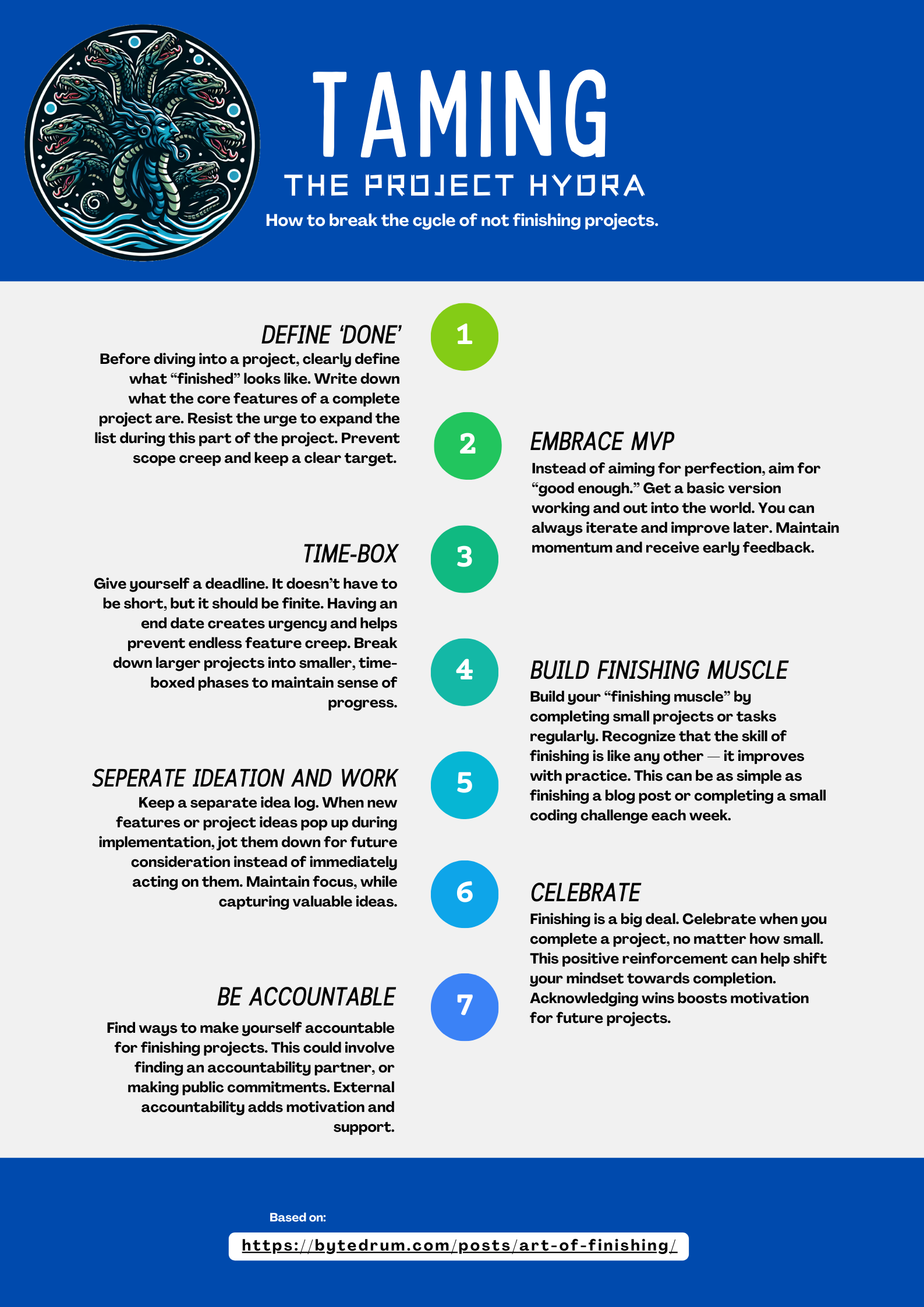 And recently I saw another great post. This one from Tomas Stropus on "The art of Finishing". Tomas thoughtfully analyzes the problem of the Project Hydra. Again, all open doors. I've known about this all for ages. But never before did it click as much as when I read this. It was a very intimate match with the problems I encounter as a solo-dev with loads of projects alive or in planning.