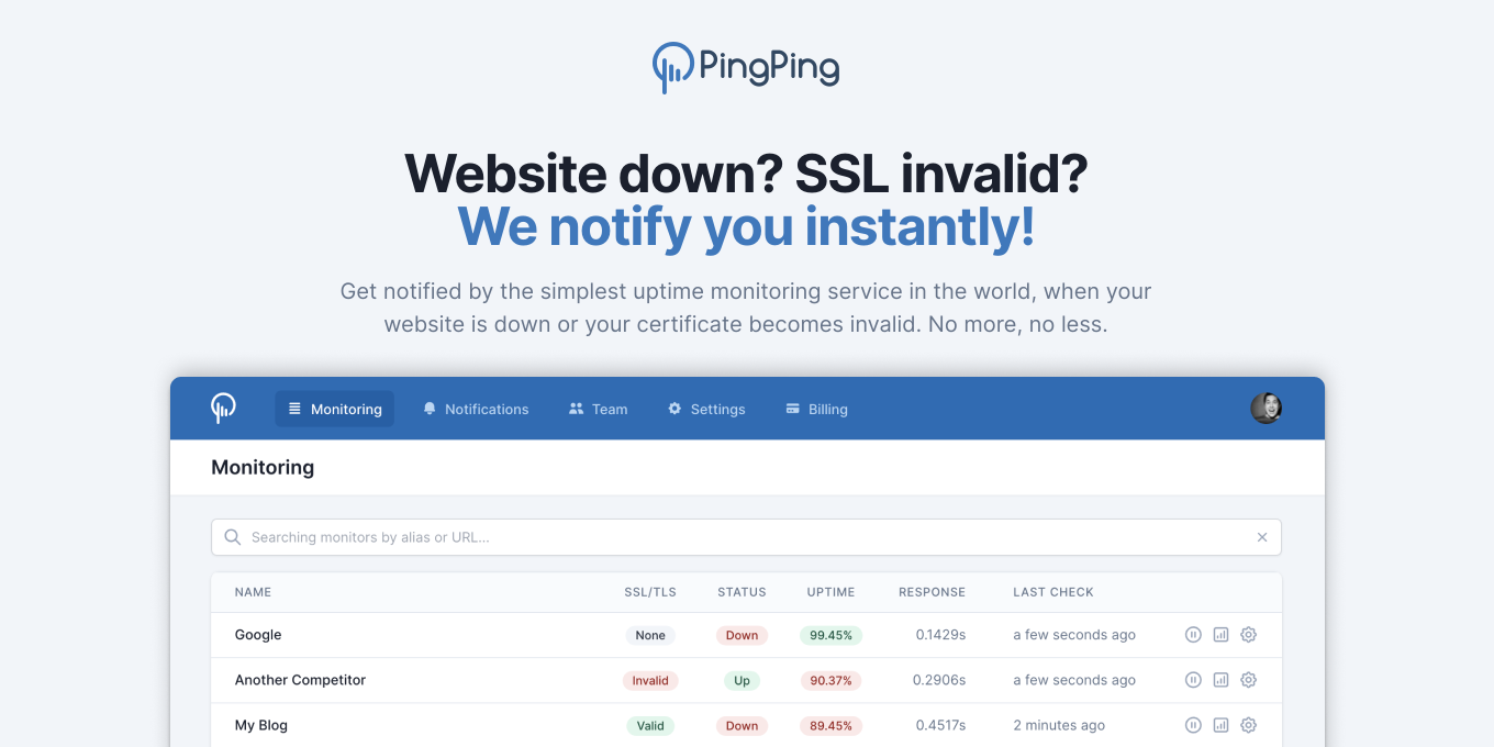 PingPing is a straight-to-the-point uptime monitoring service that also notifies you when your SSL certificate expires. It does exactly what it needs to, without any additional bells and whistles. And very cost effective as well (I'm biased as I own the service).