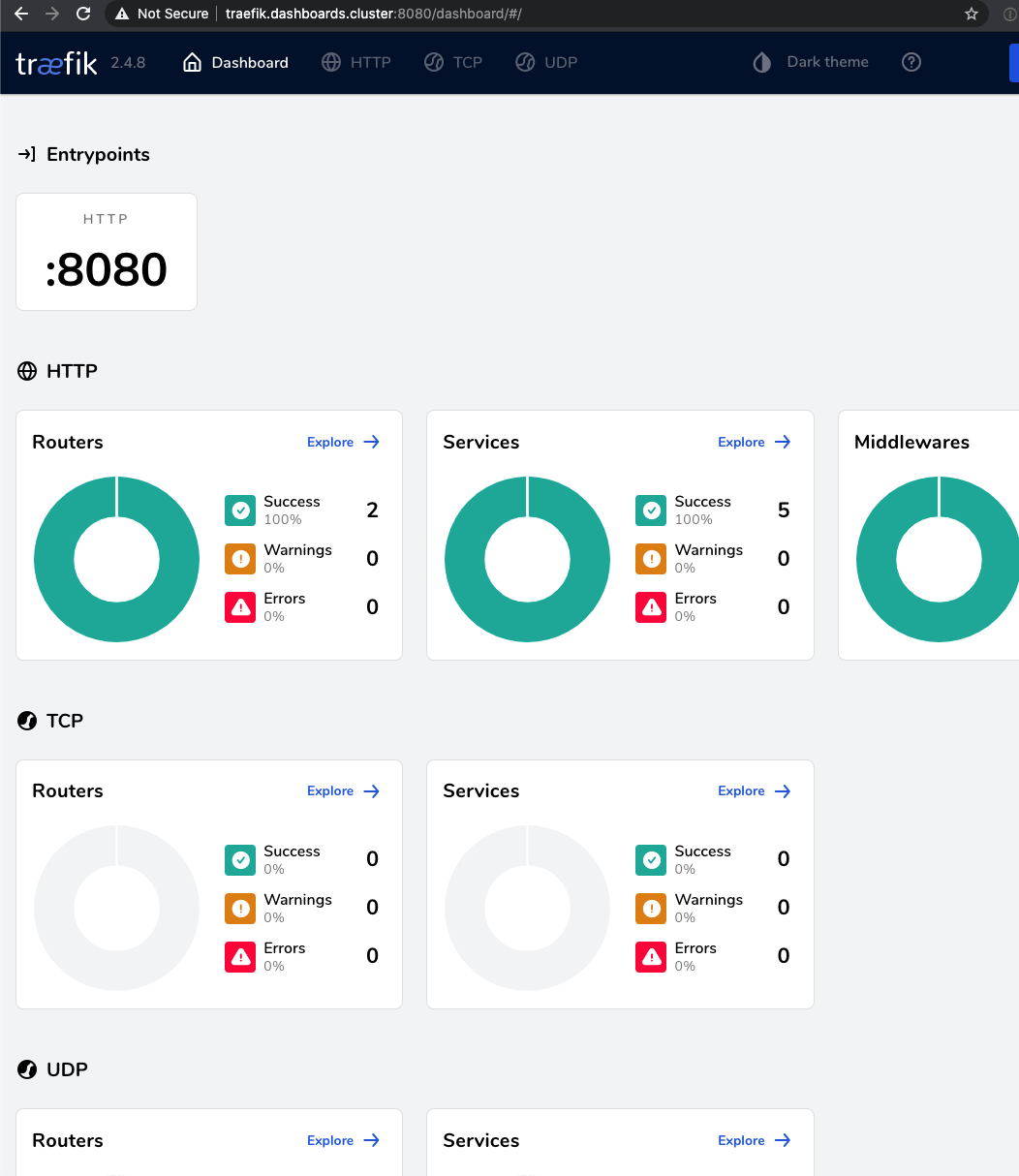 Now you should wait a minute for it to correctly deploy. Then use your browser to go to: http://traefik.dashboards.cluster:8080 and you should see: